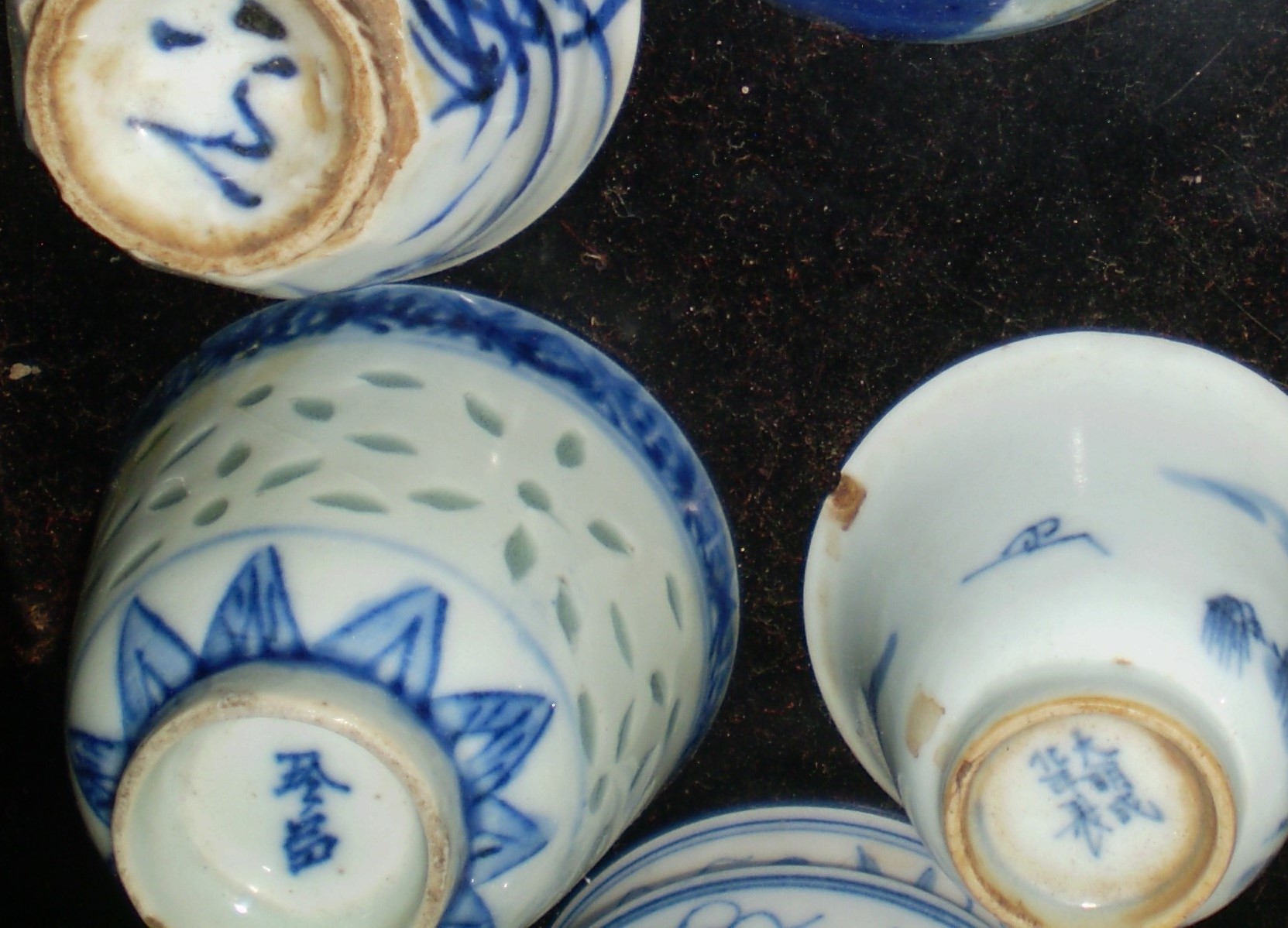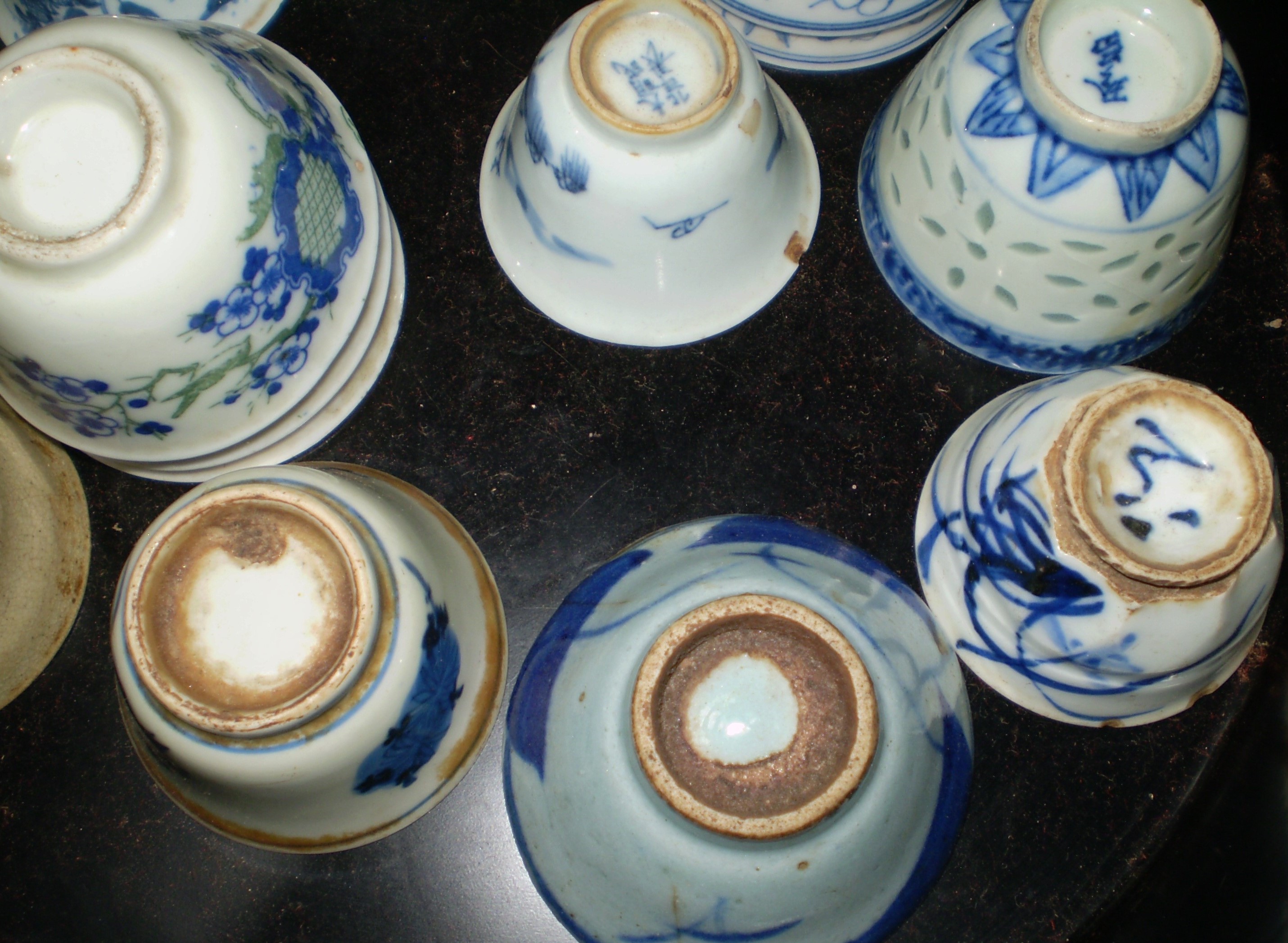 祖父が大切にしていた富士の茶櫃と煎茶碗です。 大明成化年製(中国明中期成化年間)の煎茶碗や珍品の裏印のある煎茶碗など15客です。 きれいな茶櫃と煎茶碗で祖父も、父も自慢したいものでした。私も大好きです。 |