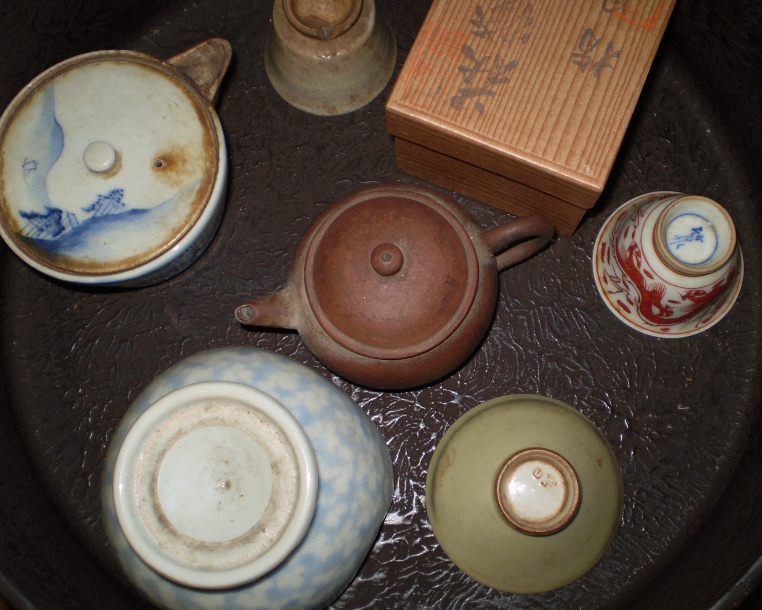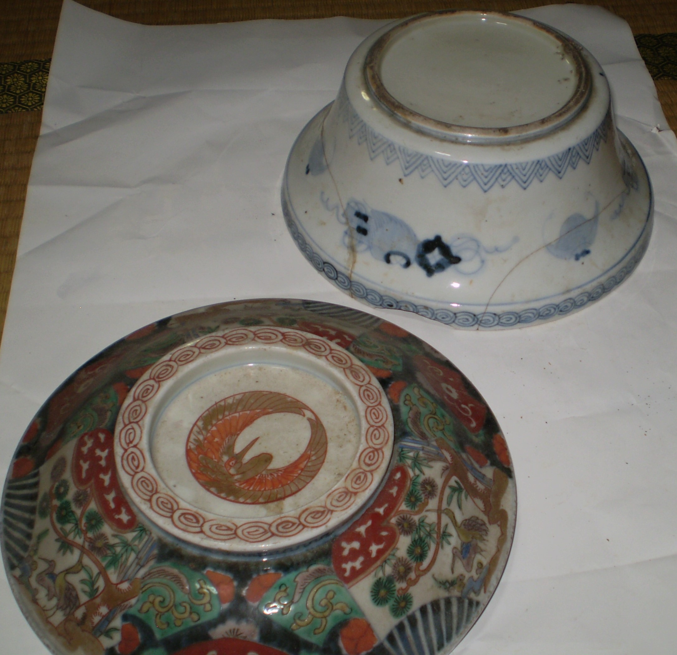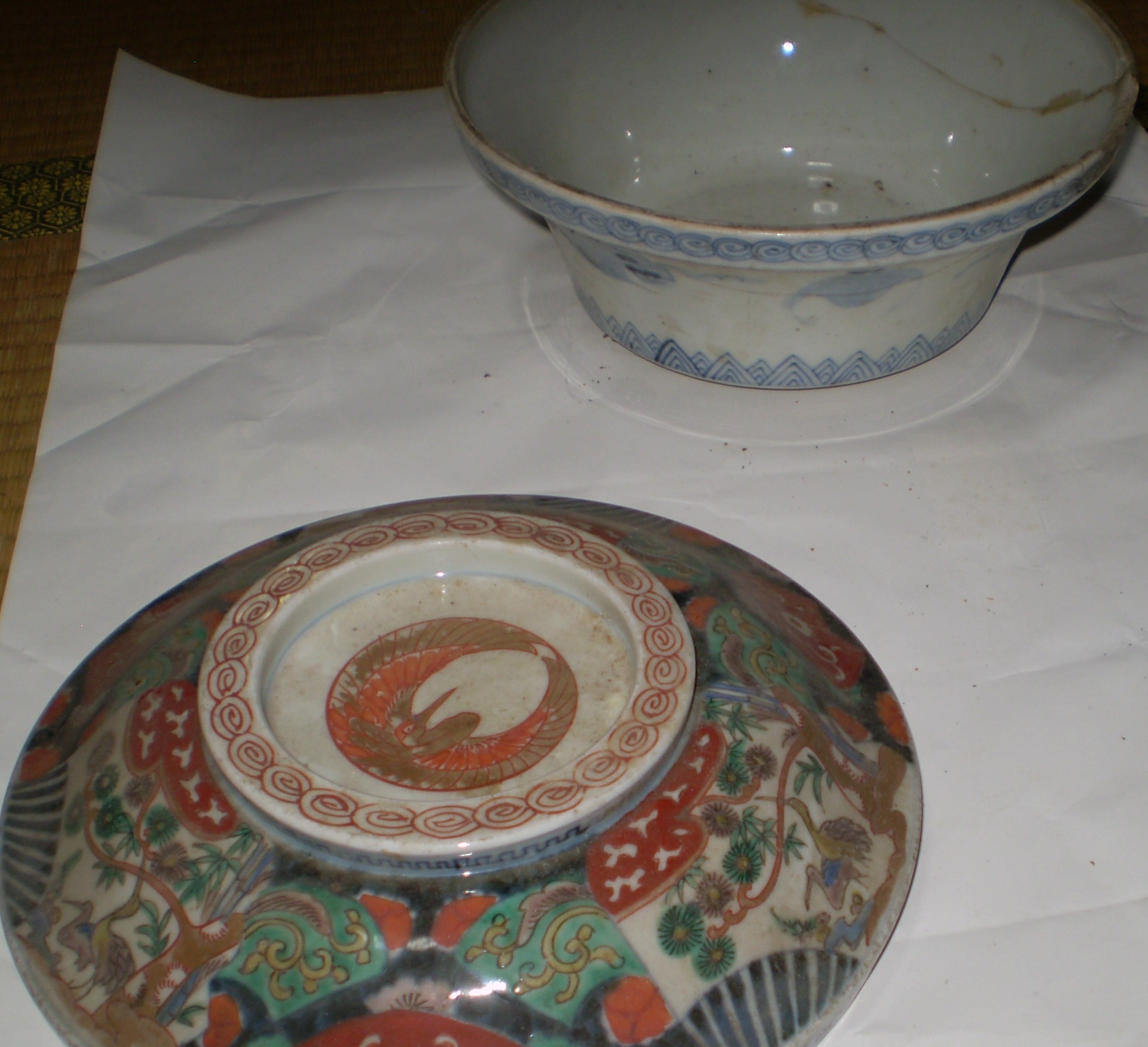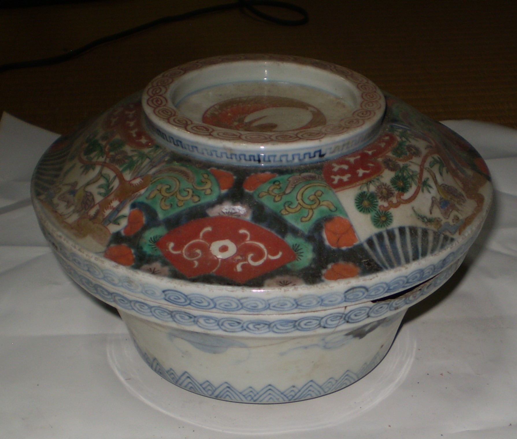 鶴の紋様がありますが、日本の家紋など調べても同じものは見つかりません。 恐らくこれも中国の古美術品だろうと思いますが、詳細は不明です。 蓋の部分は本当に蓋なのか?皿なのか?何に使うのか?もわかりませんが、面白い器ですね。 これもまた埃を被ったままです。次回は埃を落したいと思っております。 |