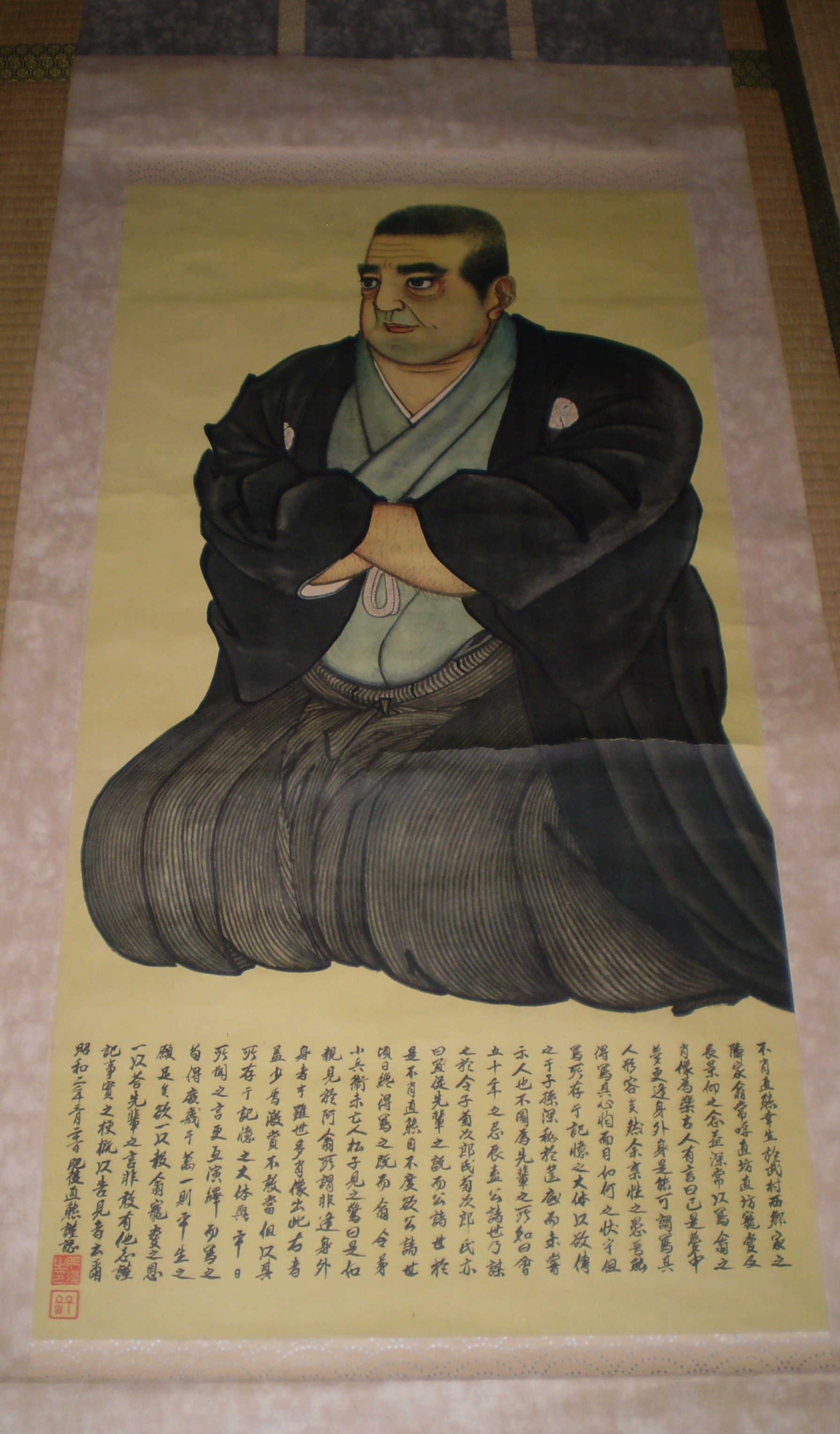 「肥後直熊」の堂々とした立派な「西郷隆盛」の掛け軸です。 「肥後直熊」は幼少の頃「西郷隆盛」の隣家に住んいて膝の上に抱っこして貰ったこともあるそうです。 写真を一枚も残さなかった「西郷隆盛」ですが、肖像画は複数あるとのことです。 そしてその中でも良く似ていると評判の高い「肥後直熊」の「西郷隆盛」です。 |