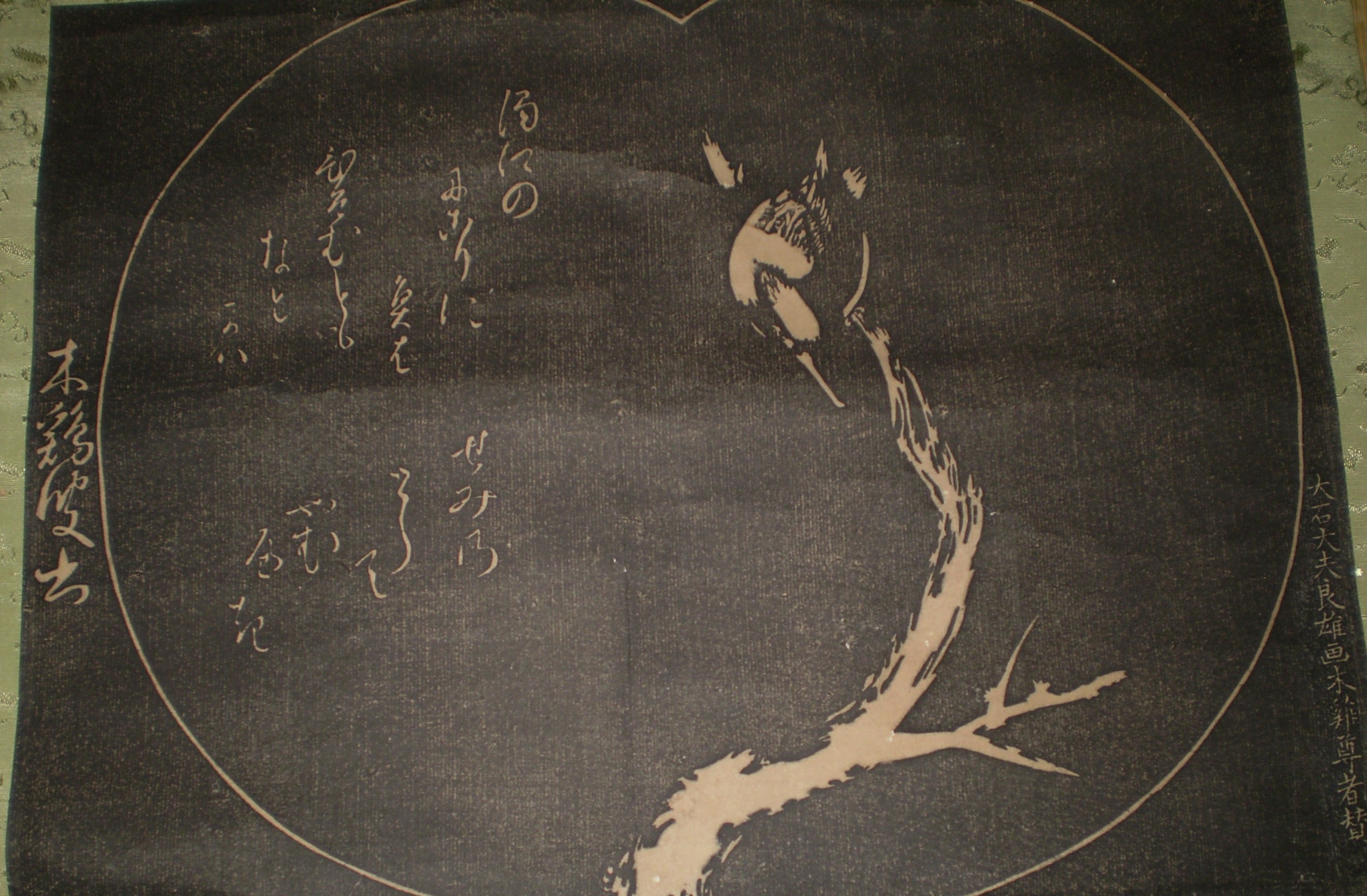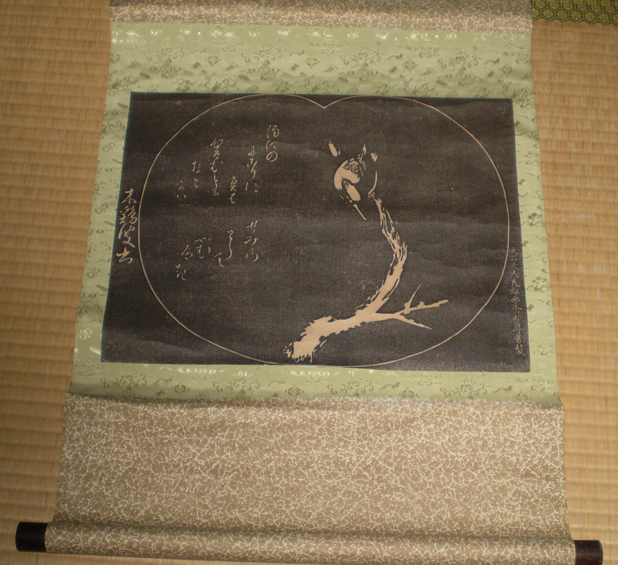 忠臣蔵の大石内蔵助、「大石太夫良夫」の 木鶏の図の掛け軸です。 大石内蔵助は自画像など好んで筆を執ったというエピソードがあり、絵心があったことが窺えます。 この掛け軸は大石内蔵助の木鶏の絵に誰か画賛をつけて掛け軸にしたものと思われます。 |