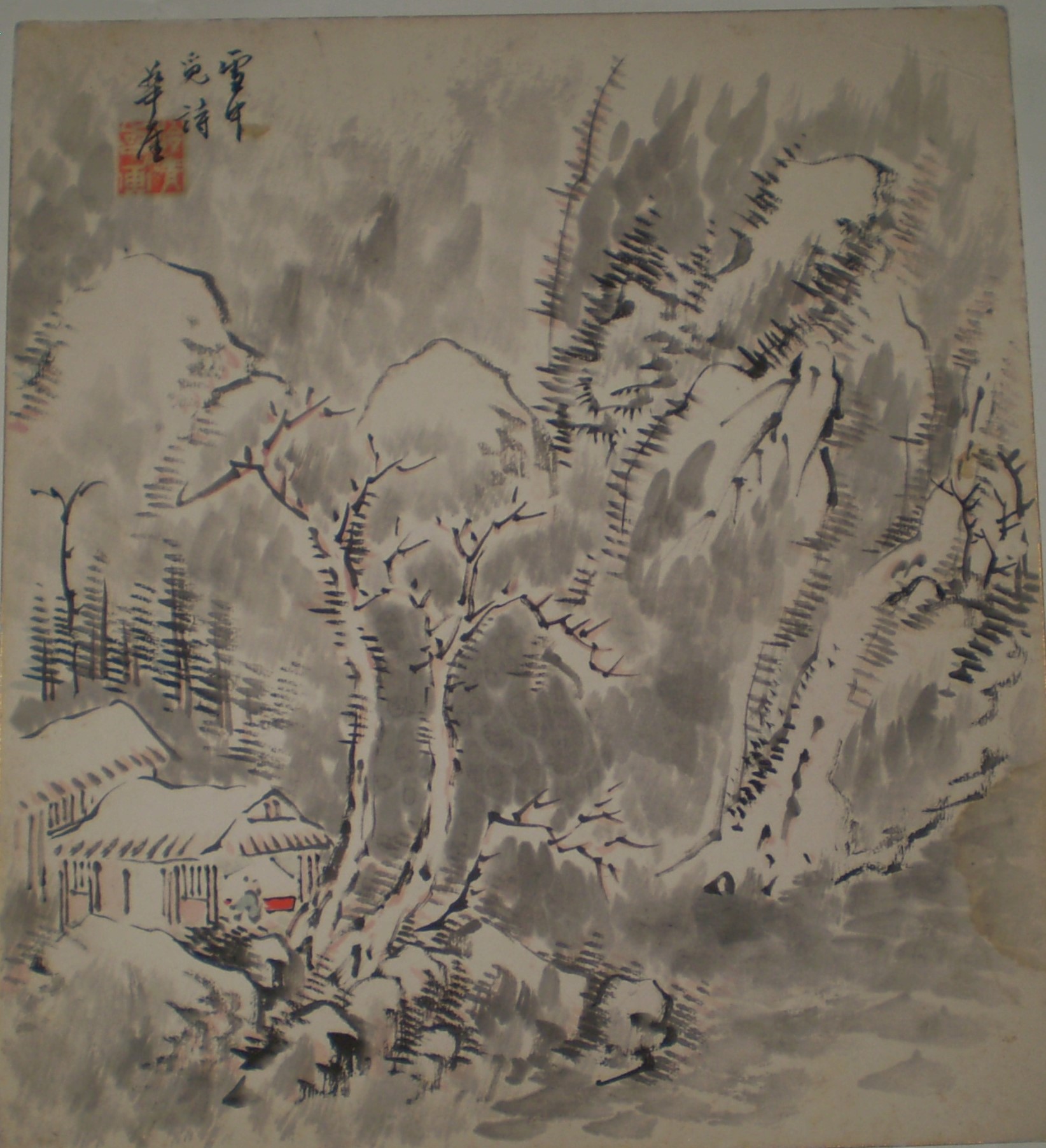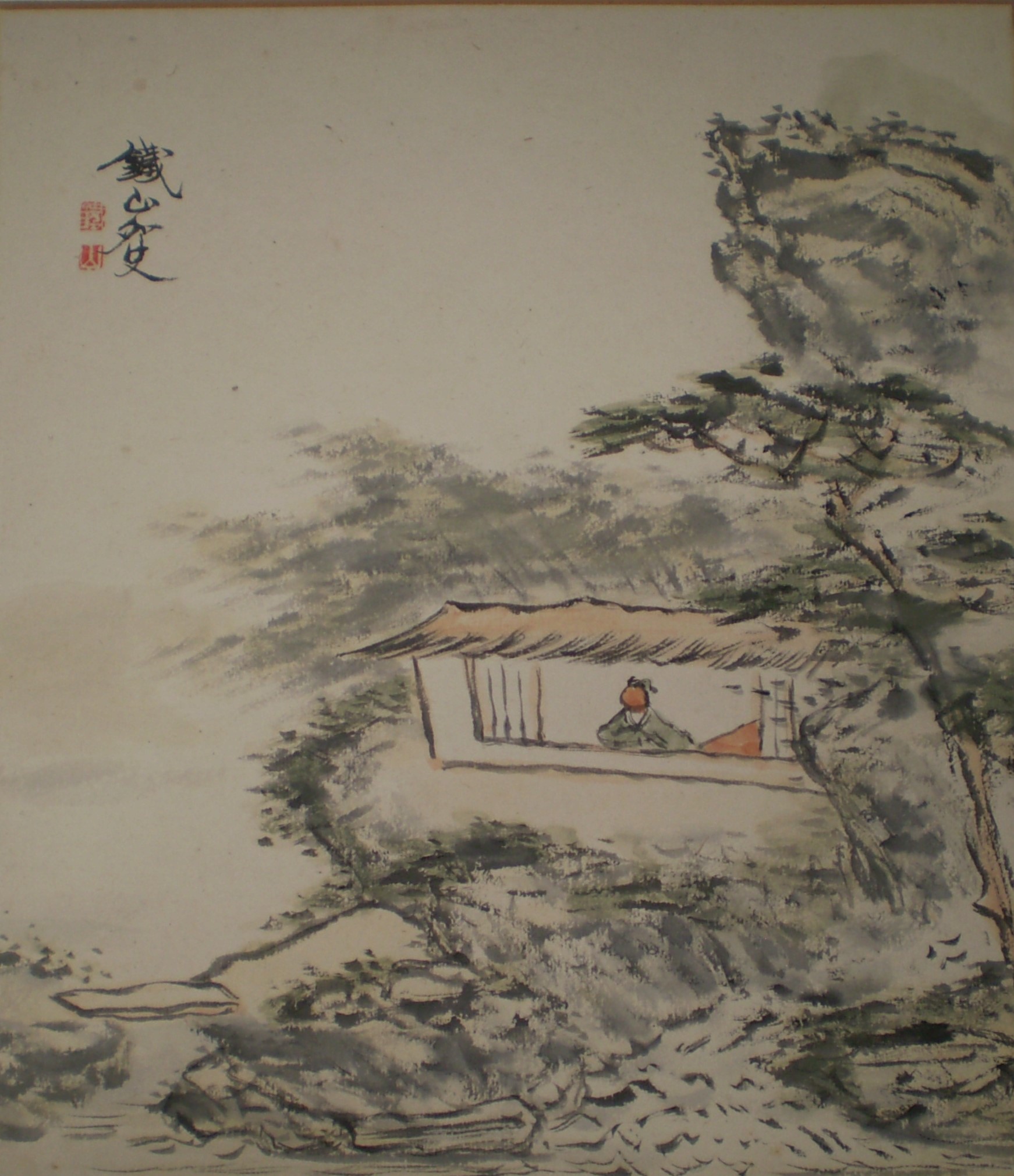 大正・昭和の愛媛の日本画家 矢野鉄山の山水画の色紙です。 愛媛の画家ということで祖父が大変自慢していましたので、幼かった私も記憶が残っております。 |