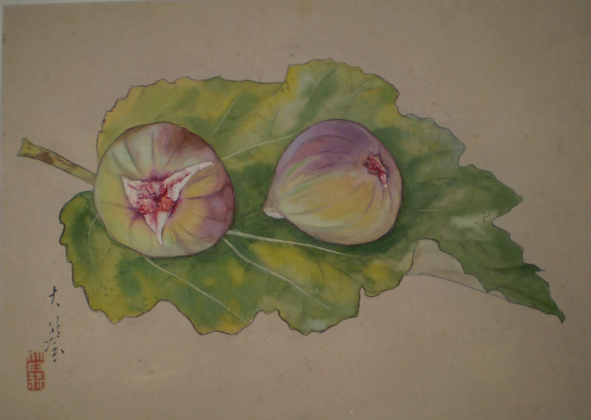 これも無学で絵師は解読できません。 イチジクの絵で、絵師は掛け軸にも良く出てくる名ですが、読み取る力がなく大変残念です。 次のページでその掛け軸をご覧下さい。 |