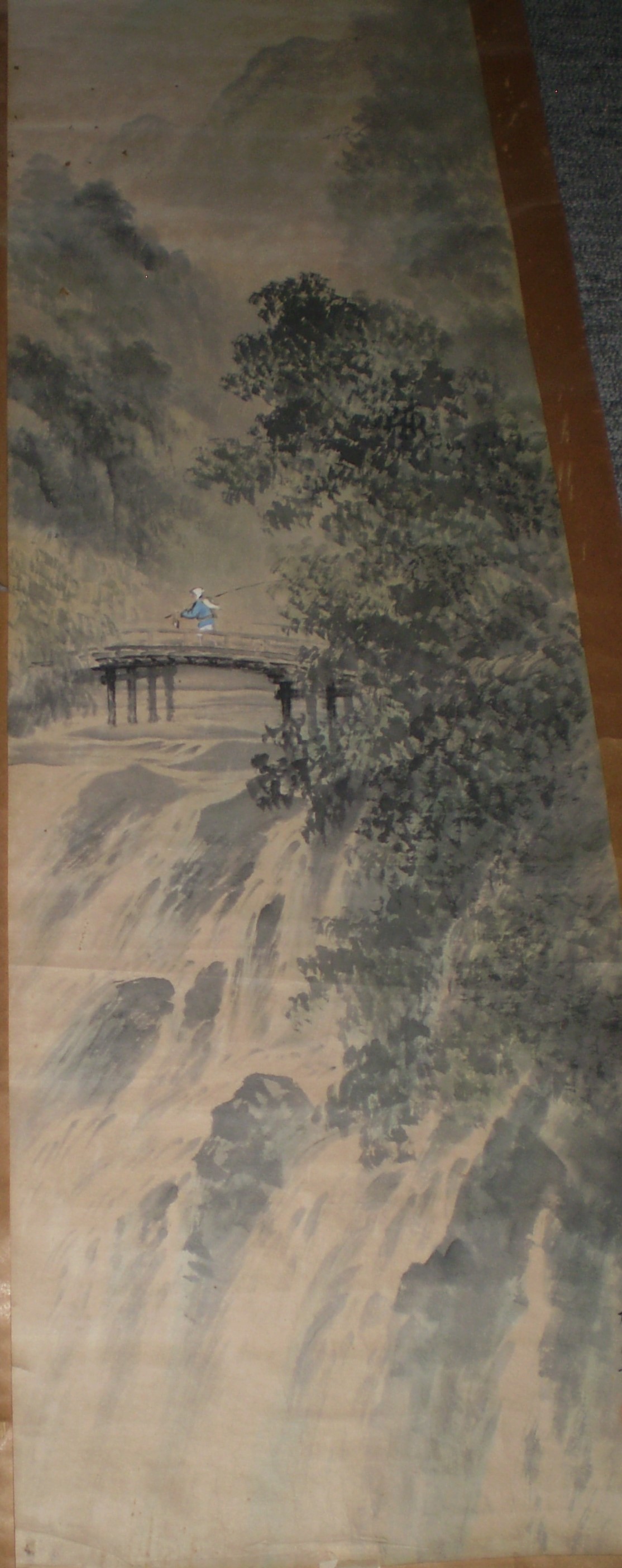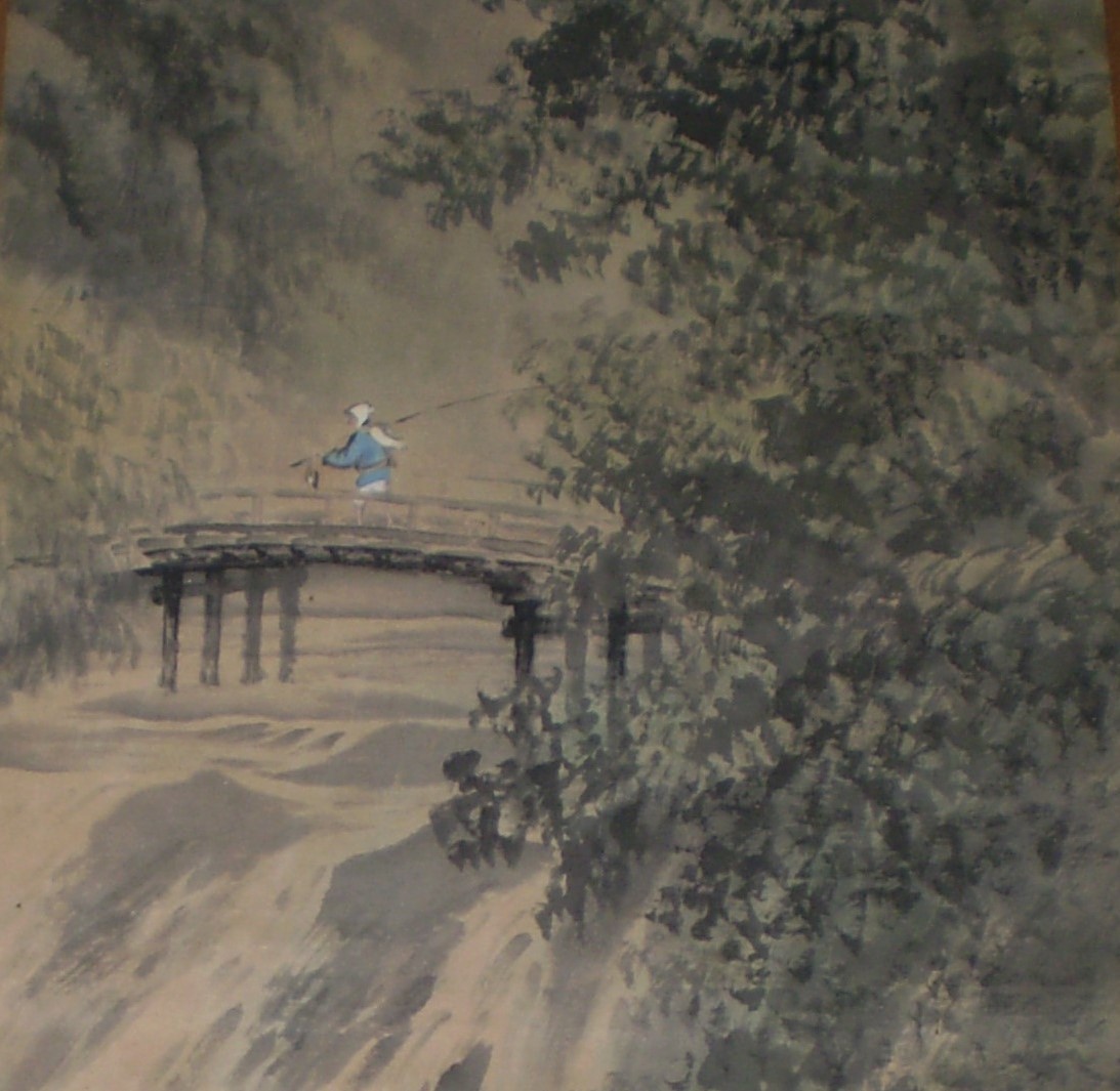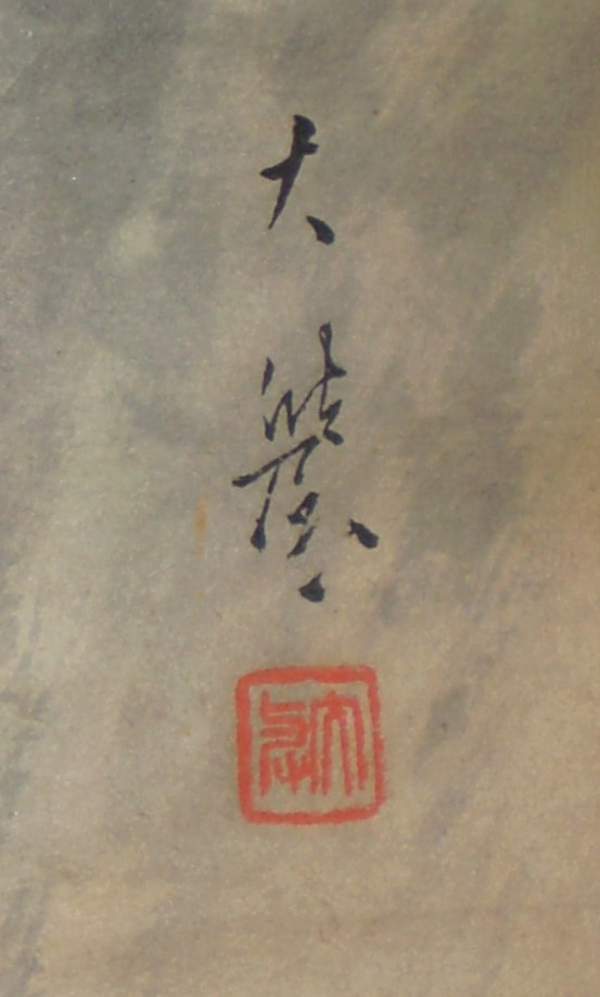 前のページのイチジクの色紙と同じ画家の山水画の掛け軸です。 詳しいことは全くわからないのですが、非常にきれいな山水画であると思います。 古美術商に見てもらいたいとは思っておりますが、その前に手入れが必要と思っています。。 絵師についてわかる方がいらっしゃればお教え下さい。 |