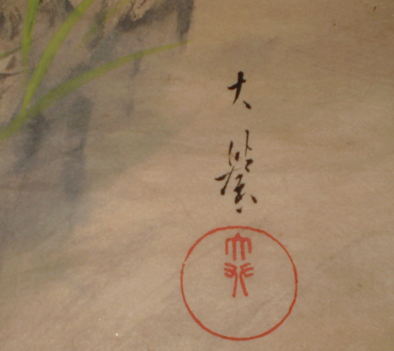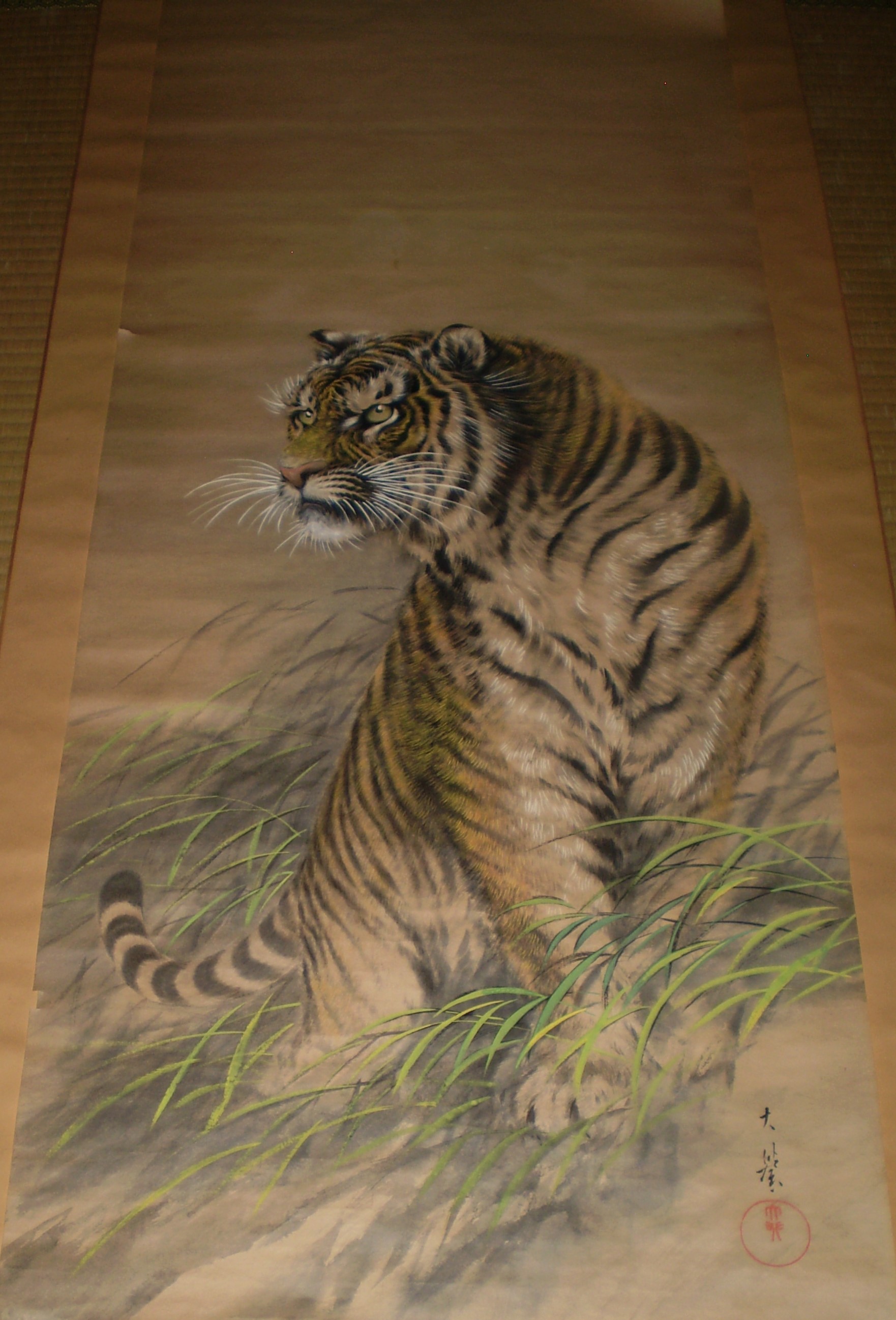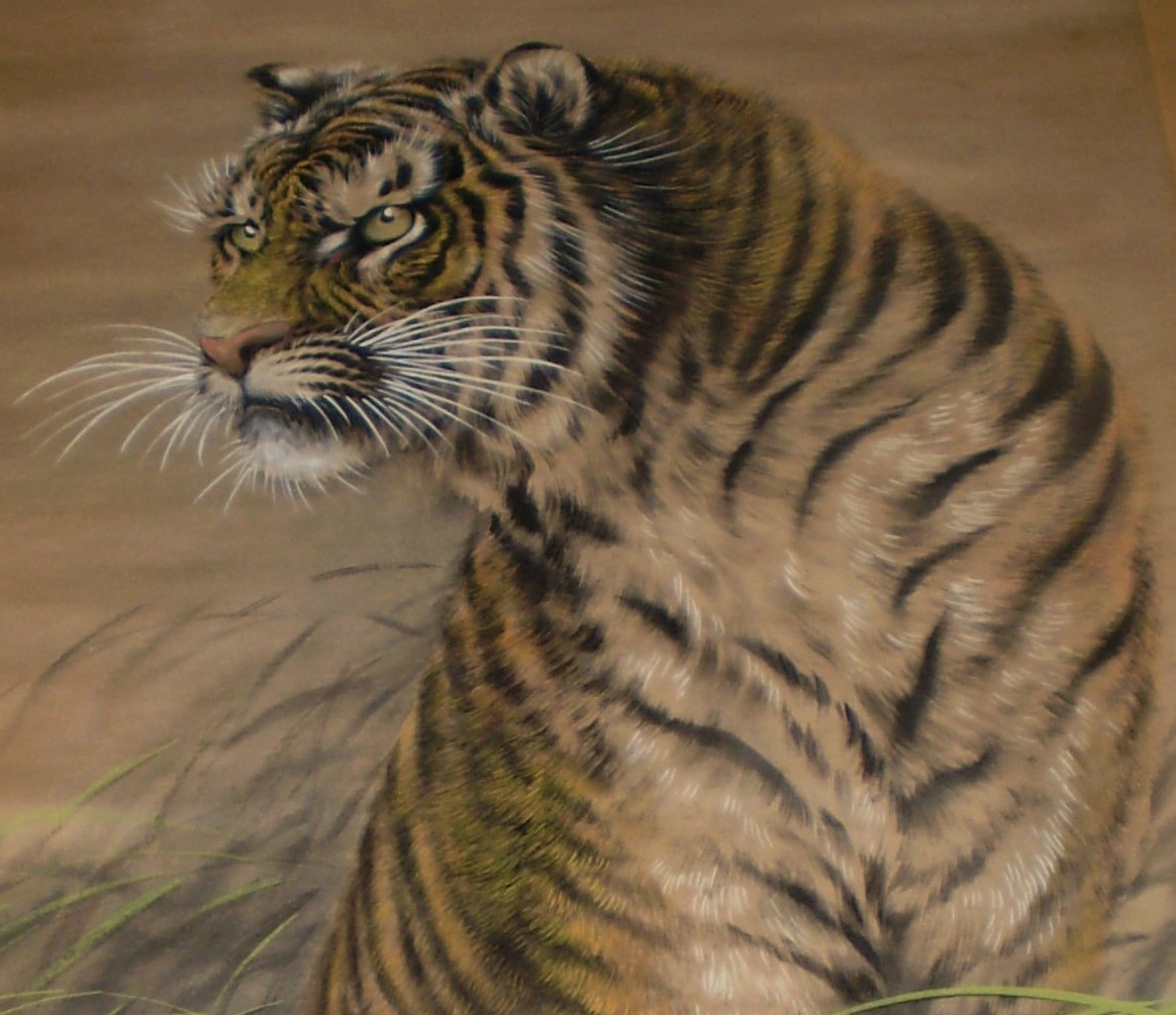 前のページのイチジクの色紙と同じ画家の虎のの掛け軸です。 詳しいことは全くわからないのですが、非常に迫力のある虎の絵であると思います。 古美術商に見てもらいたいとは思っておりますが、その前に手入れが必要と思っています。。 絵師についてわかる方がいらっしゃればお教え下さい。 |